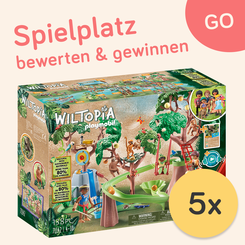 PLAYMOBIL und Spielplatztreff laden euch ein zu einem unvergesslichen Spielplatzabenteuer auf den tropischen Wiltopia Dschungel-Spielplatz. Klettert mit den Affen um die Wette oder schwingt ein paar Runden an der Schaukel. So viel Action macht hungrig. Die leckeren Früchte können von den Bäumen geerntet und über die geschwungene Kugelbahn abtransportiert werden. Die Spielwelt Wiltopia wird übrigens im Schnitt zu über 80 % aus recycelten und biobasierten Materialien hergestellt.