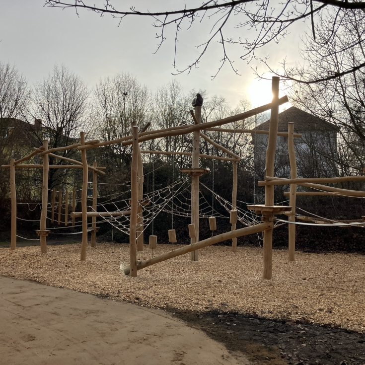 Spielgeräte: Doppelschaukel, Kletterelement, Balancier-Element, Basketballkorb, Tischtennisplatte
